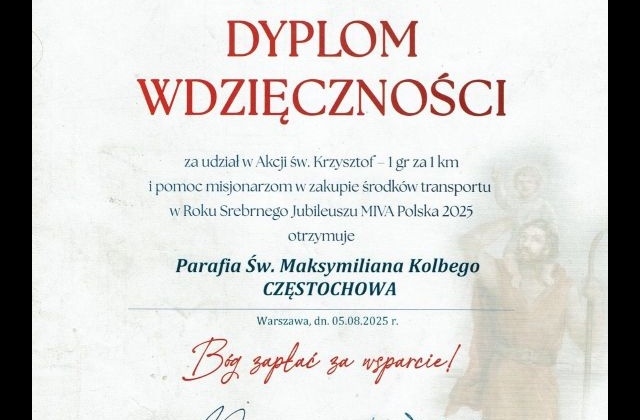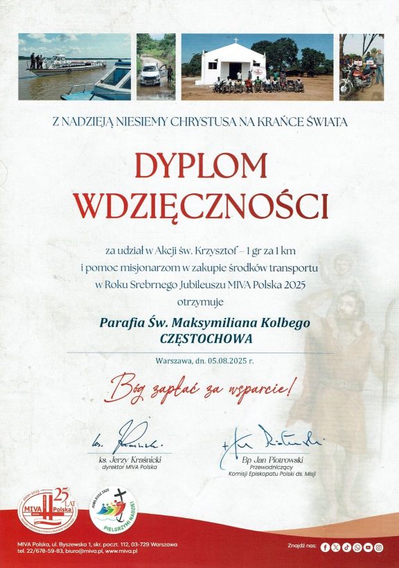 Dyplom wdzięczności dla naszej parafii od MIVA Polska