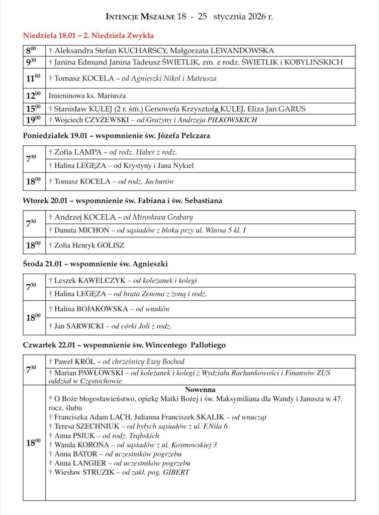 PIĄTA NIEDZIELA ZWYKŁA – 8 LUTEGO 2026 R. Ogłoszenia Parafialne / By nowyinternet Luty 8, 2025 Ogłoszenia Parafialne Podziękowania: Bardzo serdecznie dziękujemy wszystkim, którzy uczestniczyli w sprzątaniu świątecznych dekoracji. Zbiórki i wsparcie: Bóg zapłać za wsparcie udzielone częstochowskiemu…