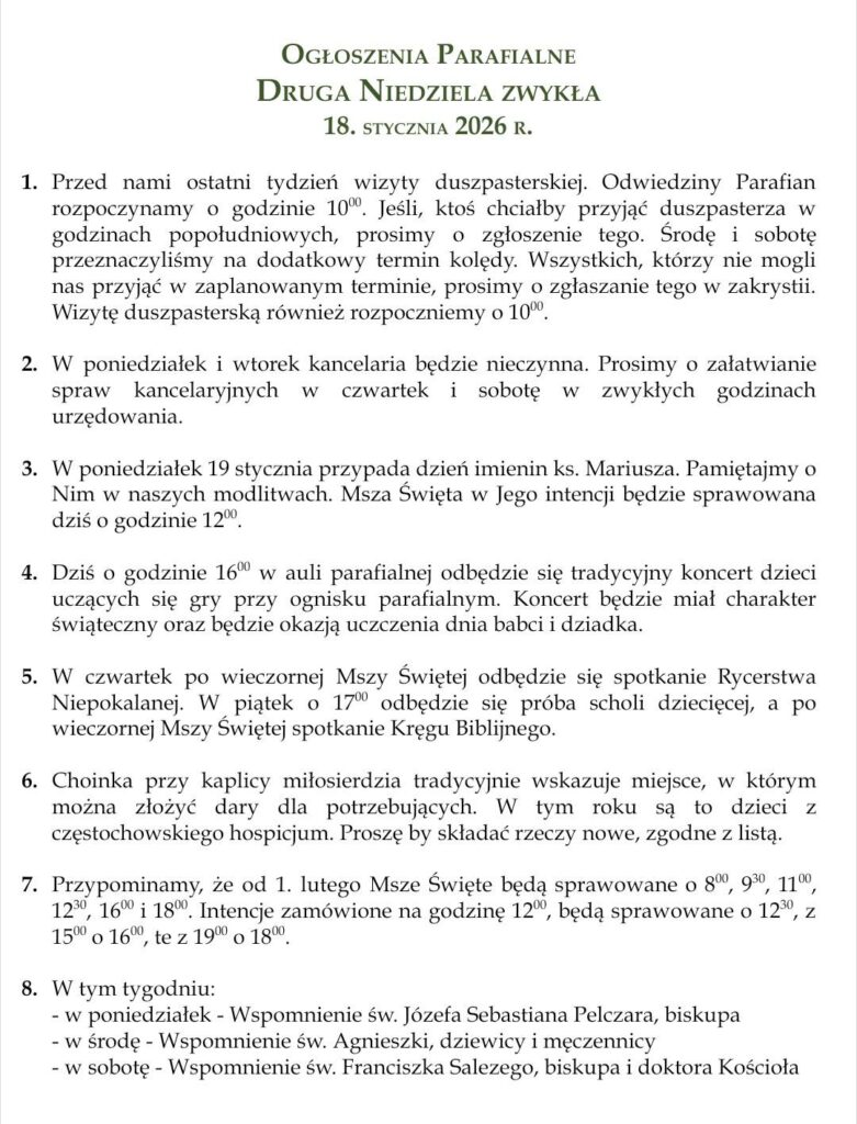CZWARTA NIEDZIELA ZWYKŁA – 1 LUTEGO 2026 R. Ogłoszenia Parafialne / By nowyinternet Luty 1, 2026 Ogłoszenia Parafialne